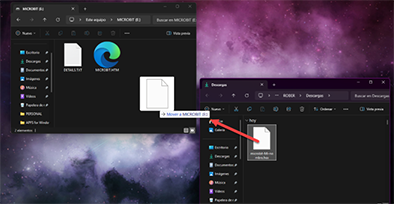 Una vez que hemos conectado la micro:bit a nuestro equipo y que ha sido reconocida como un dispositivo USB, basta con arrastrar el archivo .hex a su interior.