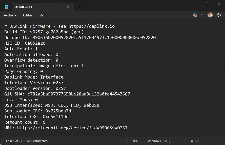 Es un archivo de texto con información técnica del dispositivo. Entre otros datos, muestra: el ID del dispositivo, la versión del firmware instalado, la versión de DAPLink (el sistema que permite la conexión USB) y el número de serie o nombre de la placa.
