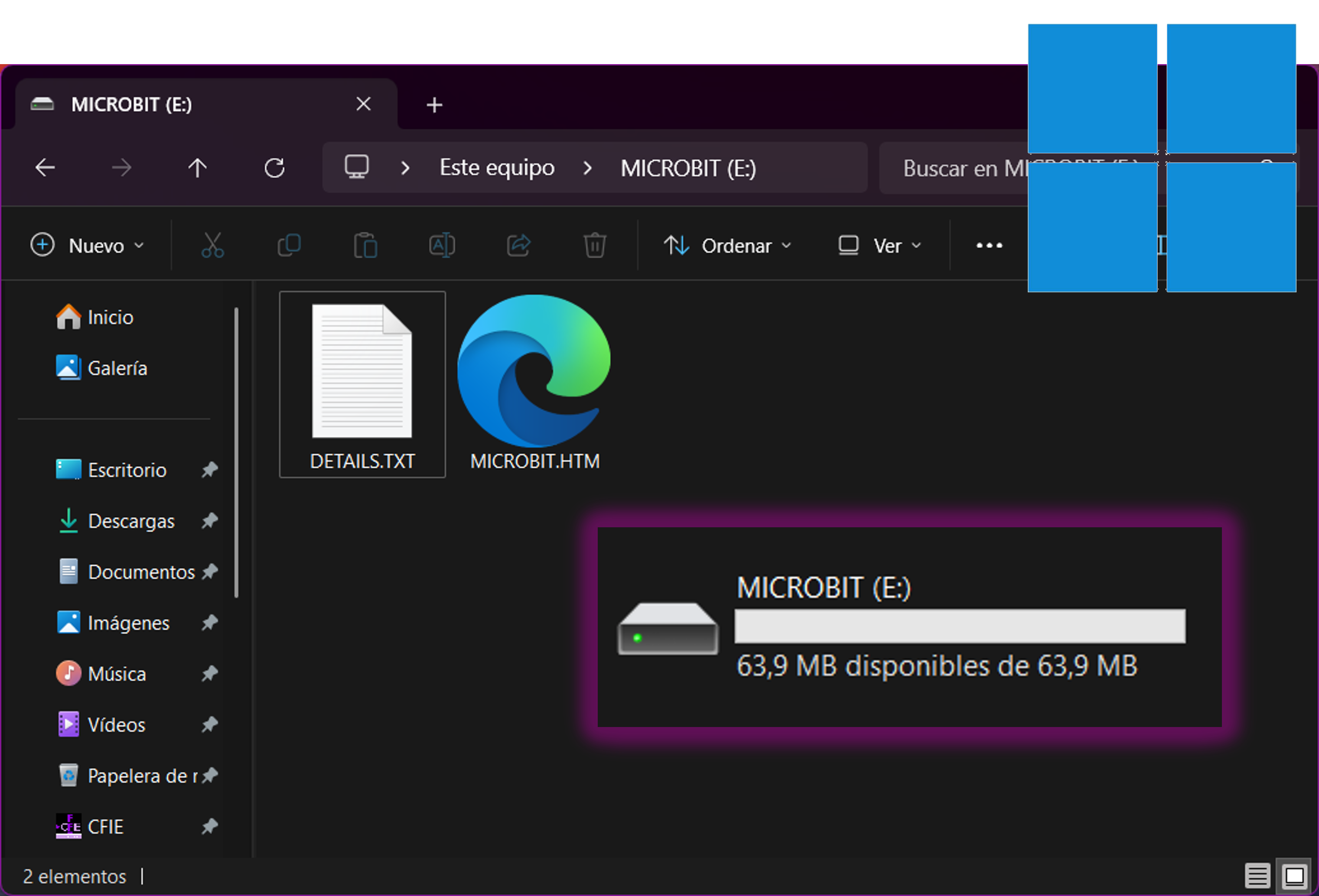 Una vez completada la actualización, la micro:bit se reiniciará, expulsándose del ordenador, y volverá a aparecer el modo de unidad MICROBIT normal.